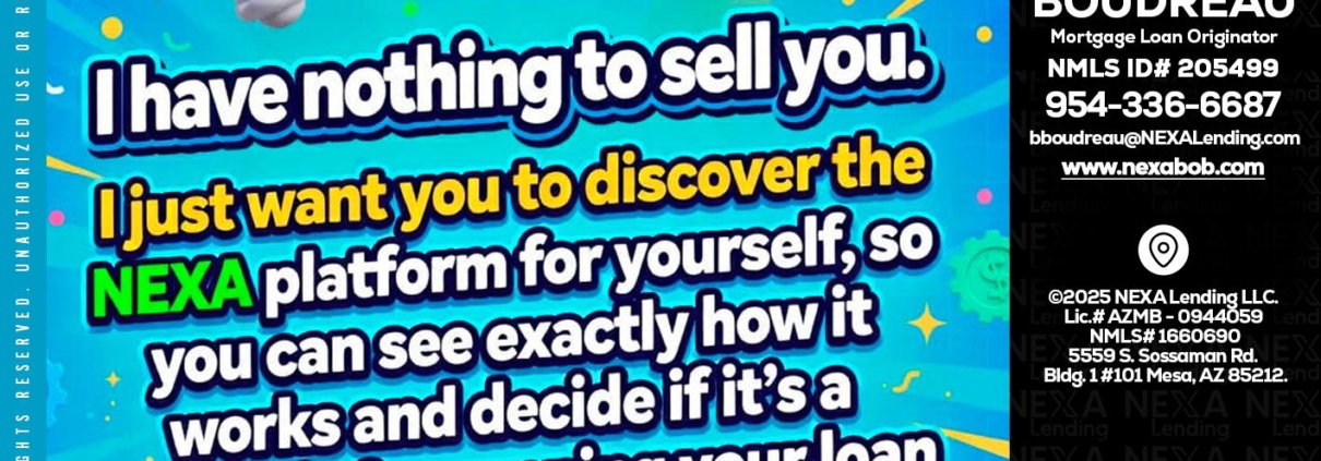 Hi, my name is Bob Boudreau. I’m a Loan Officer with NEXA Lending LLC., offering personalized mortgage solutions, fast customized quotes, great rates and service with integrity.